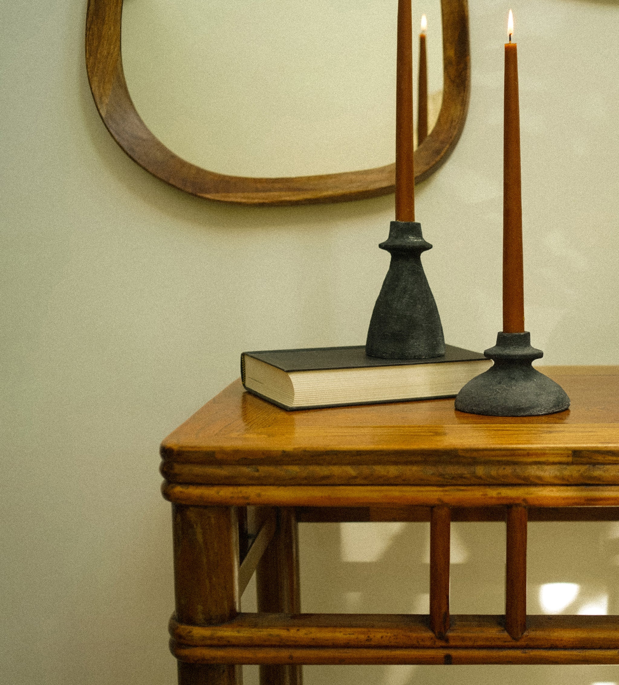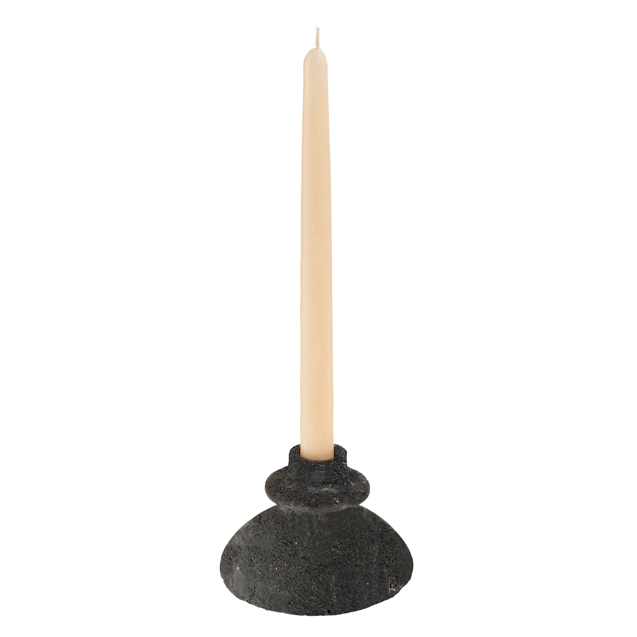 Crafted from 100% terracotta, this handmade piece features a deep matte black finish with a sandy textured surface, adding organic depth to any setting. Designed to hold tapered candles, its sculptural form blends effortlessly with both modern and rustic decor.