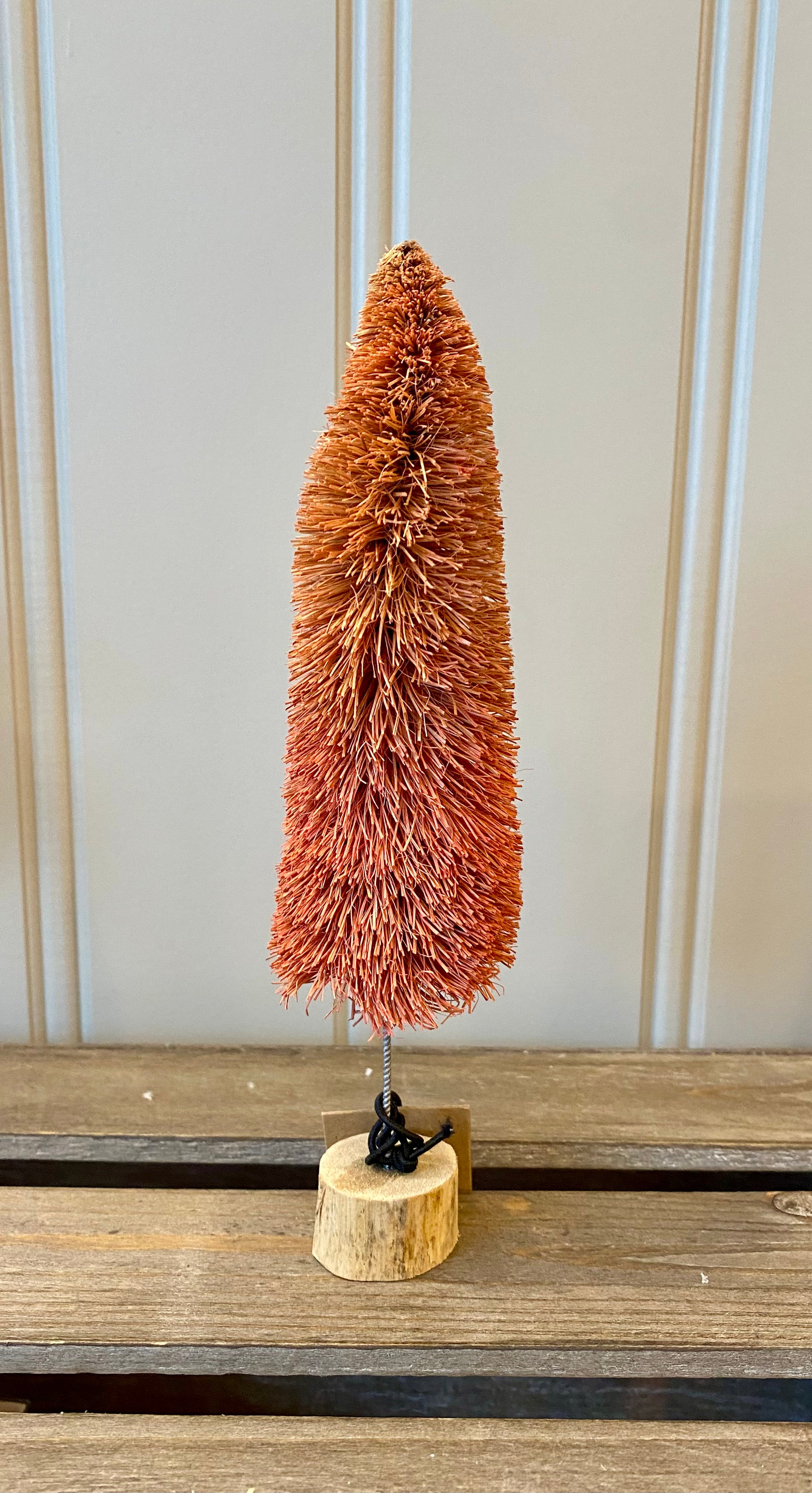 This medium sized bottle brush tree has a wooden base and measures 8"