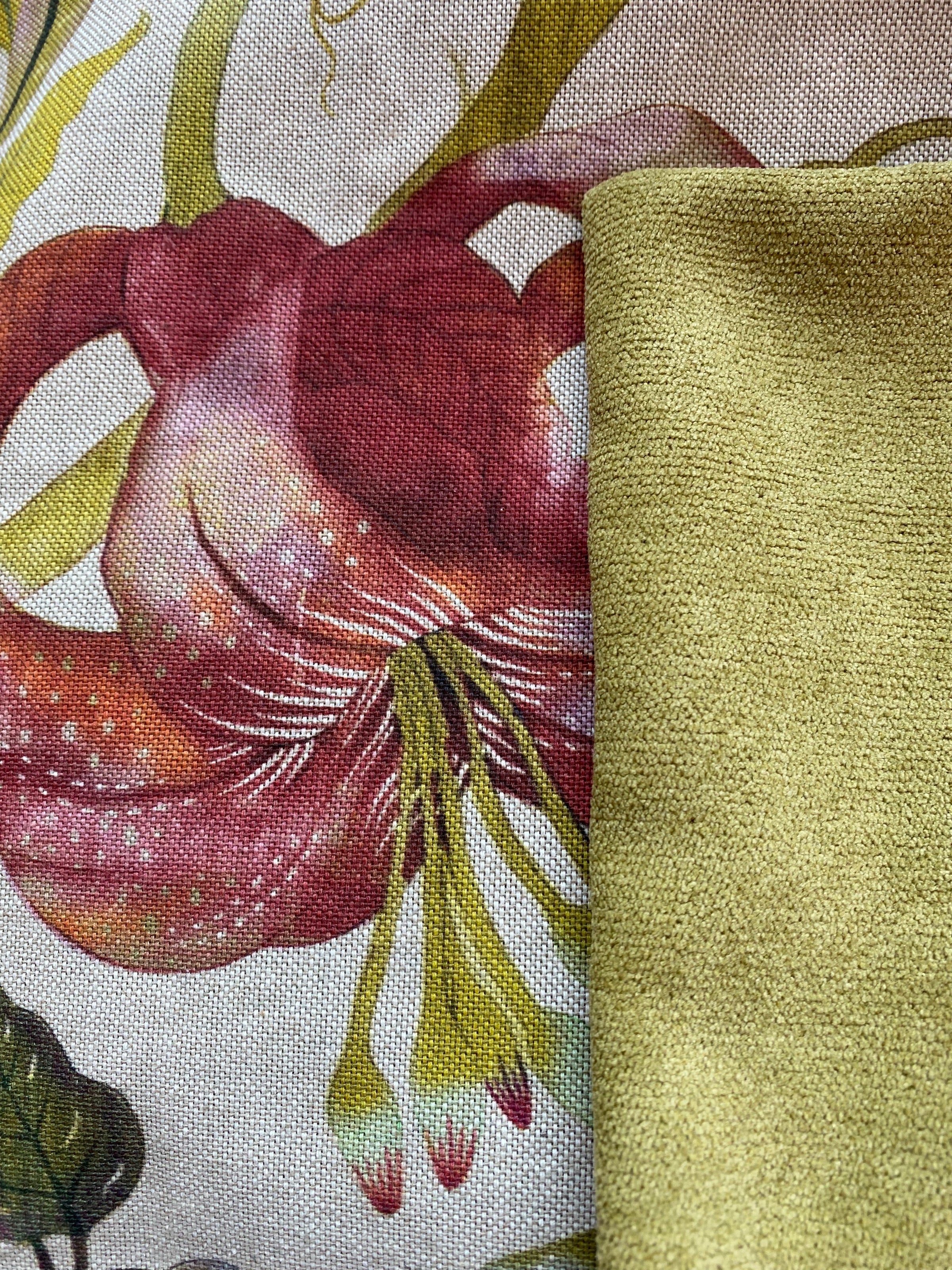 Gorgeous lilies and greenery adorn this lovely pillow. On the other side is a soft green velvet.
