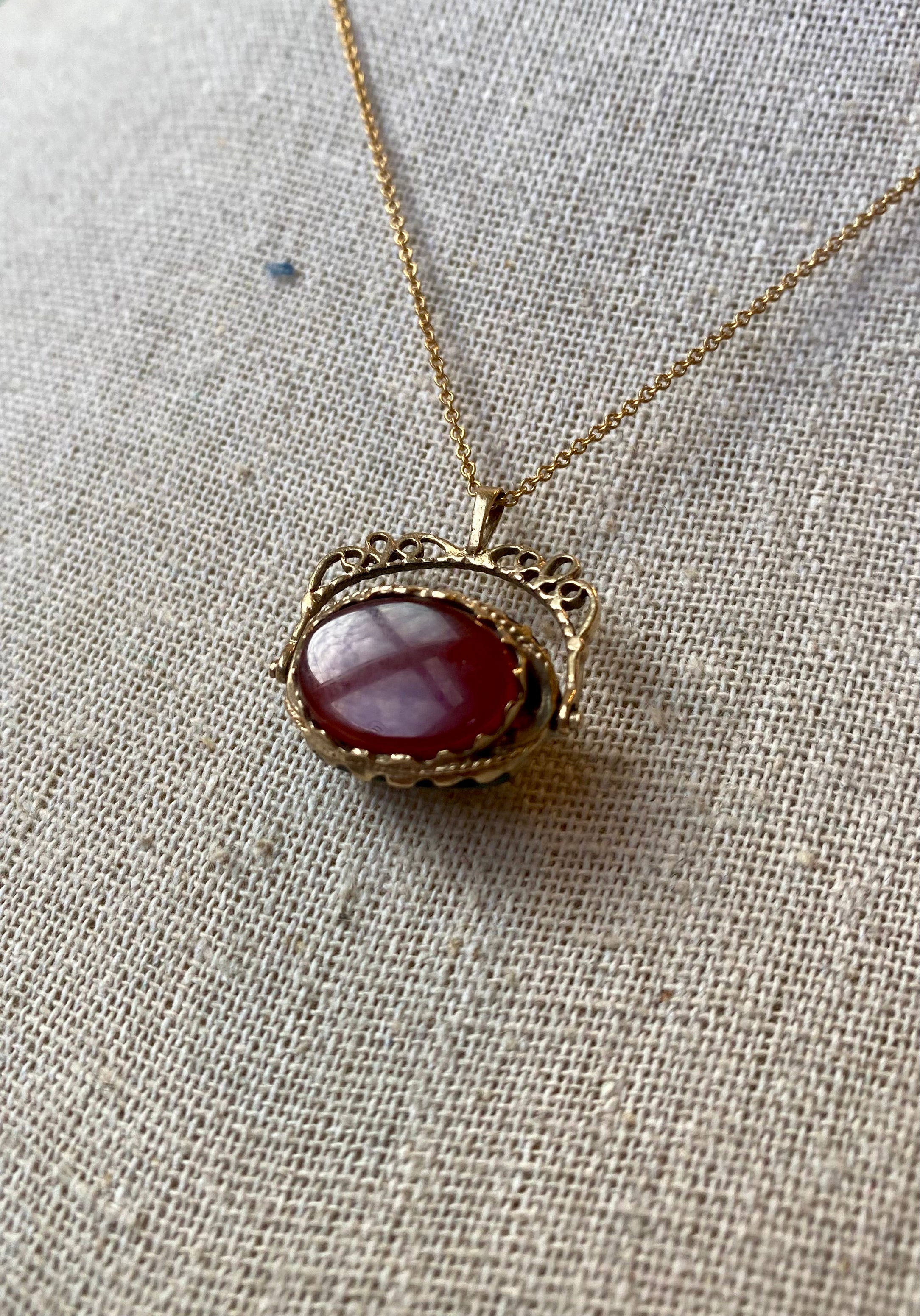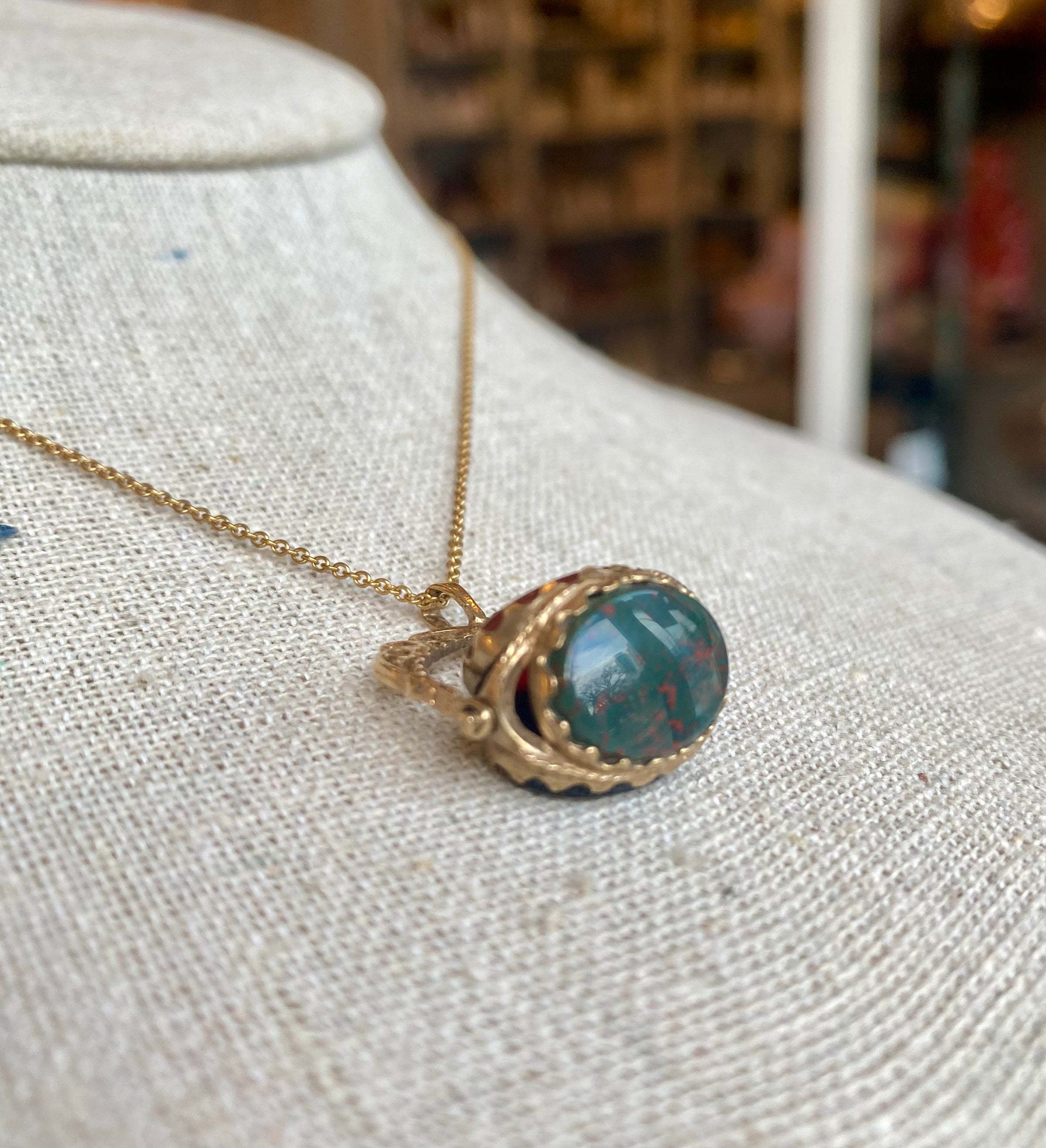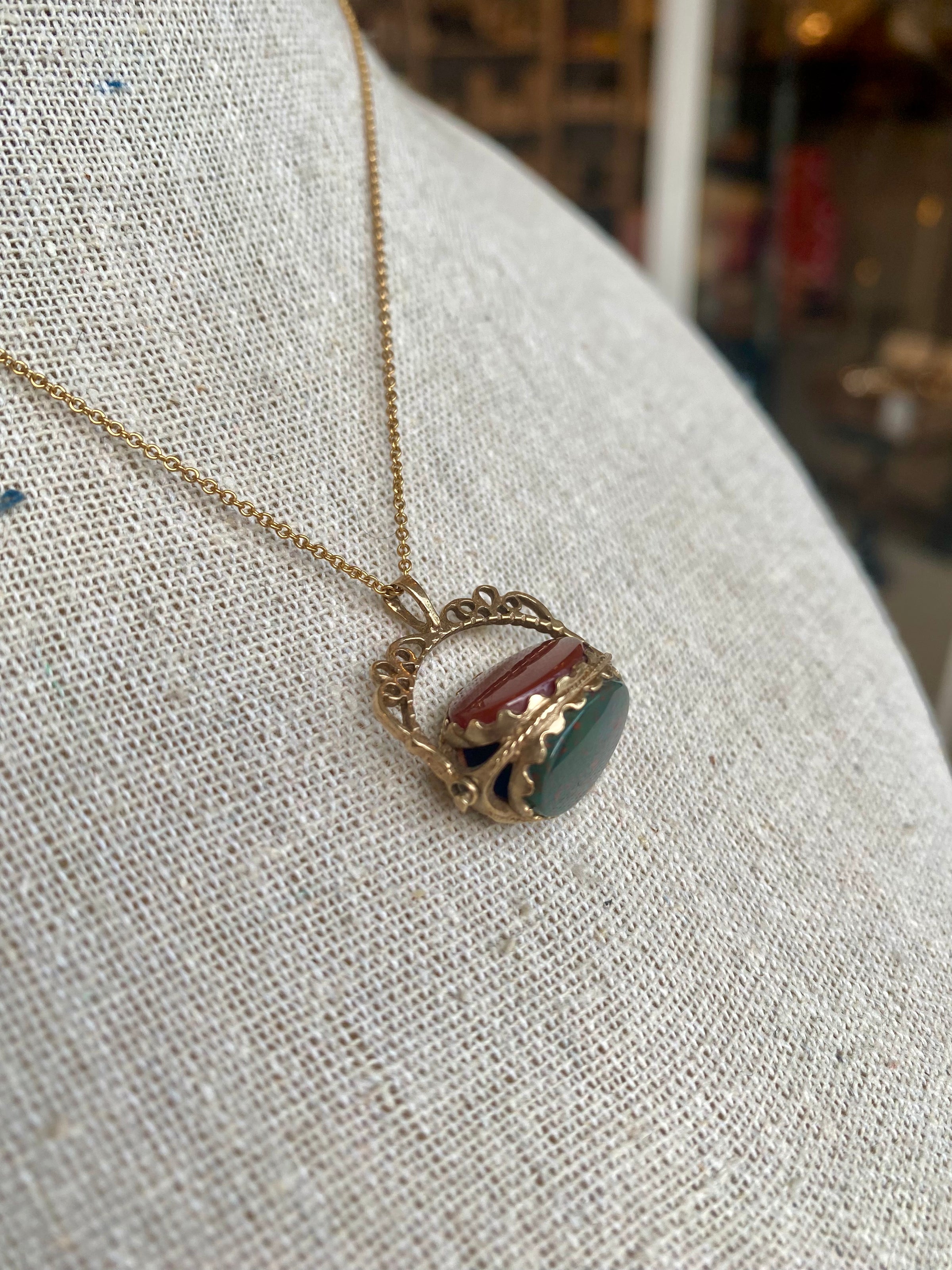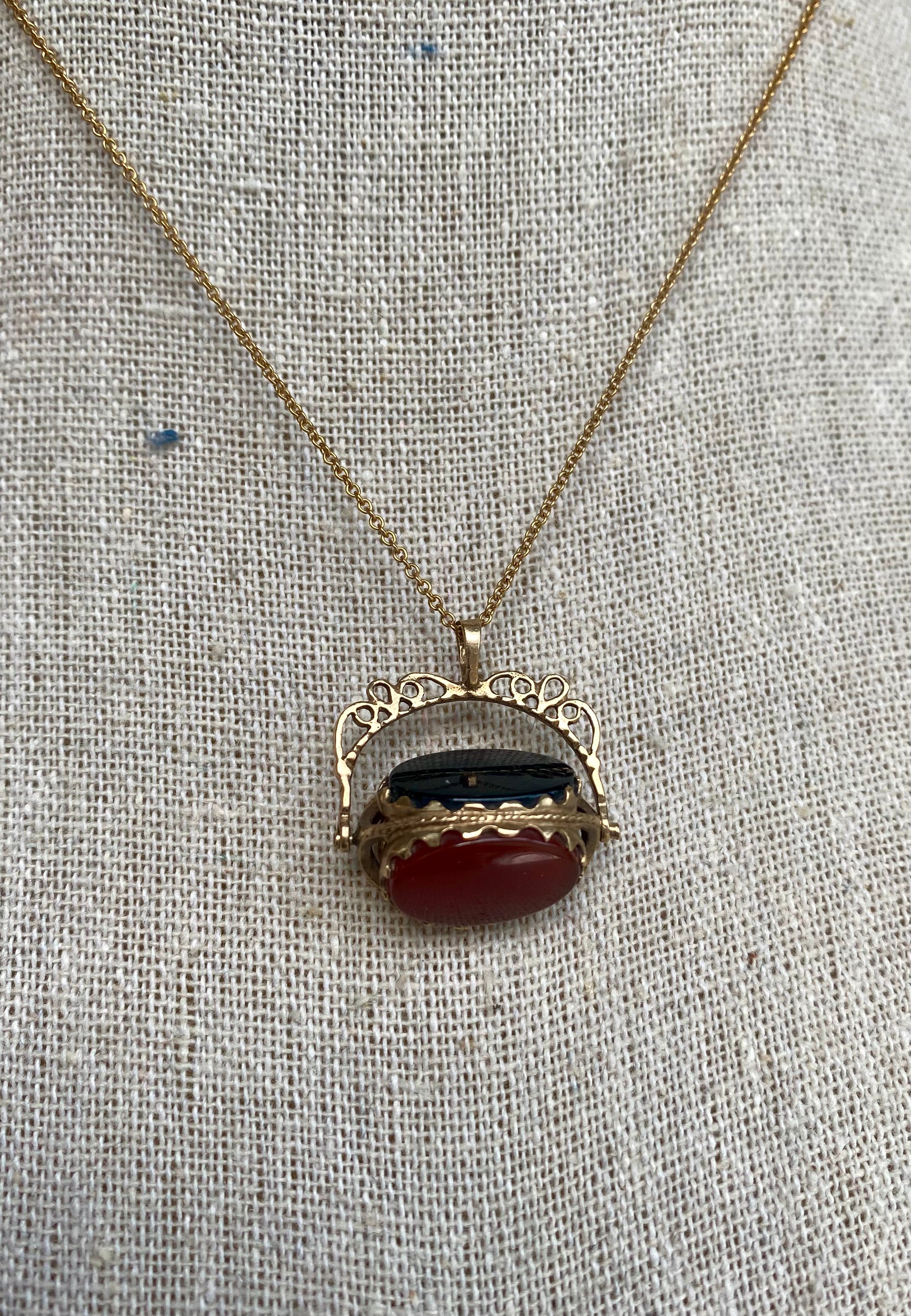 A wonderful and unique tri-lobed spinner. Featuring carnelian, bloodstone and onyx set in a delicate gold setting, this spinner makes a perfect addition to any style. Circa 1935-1950.