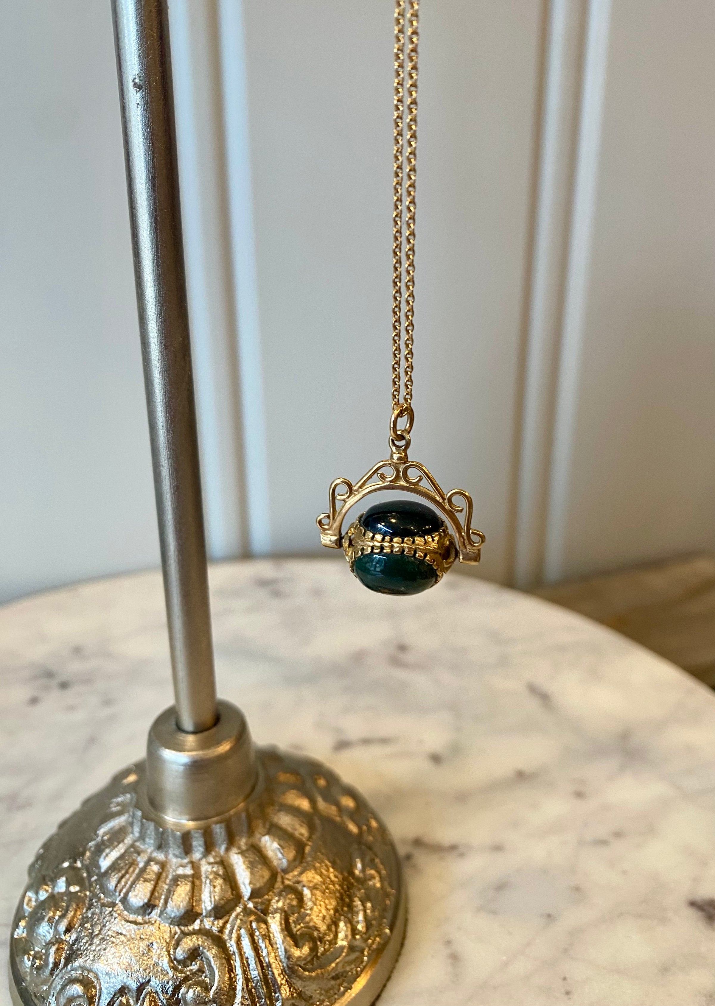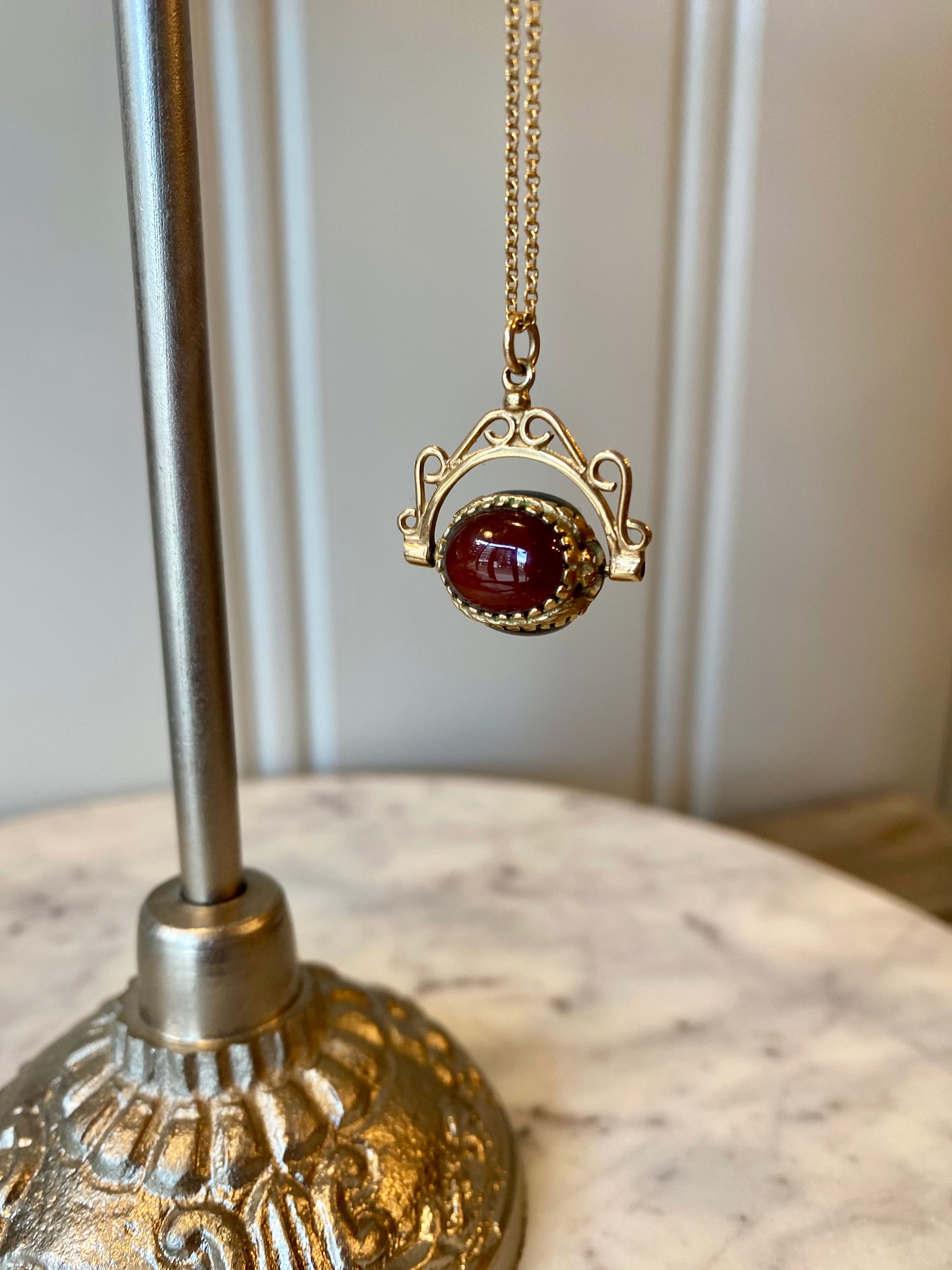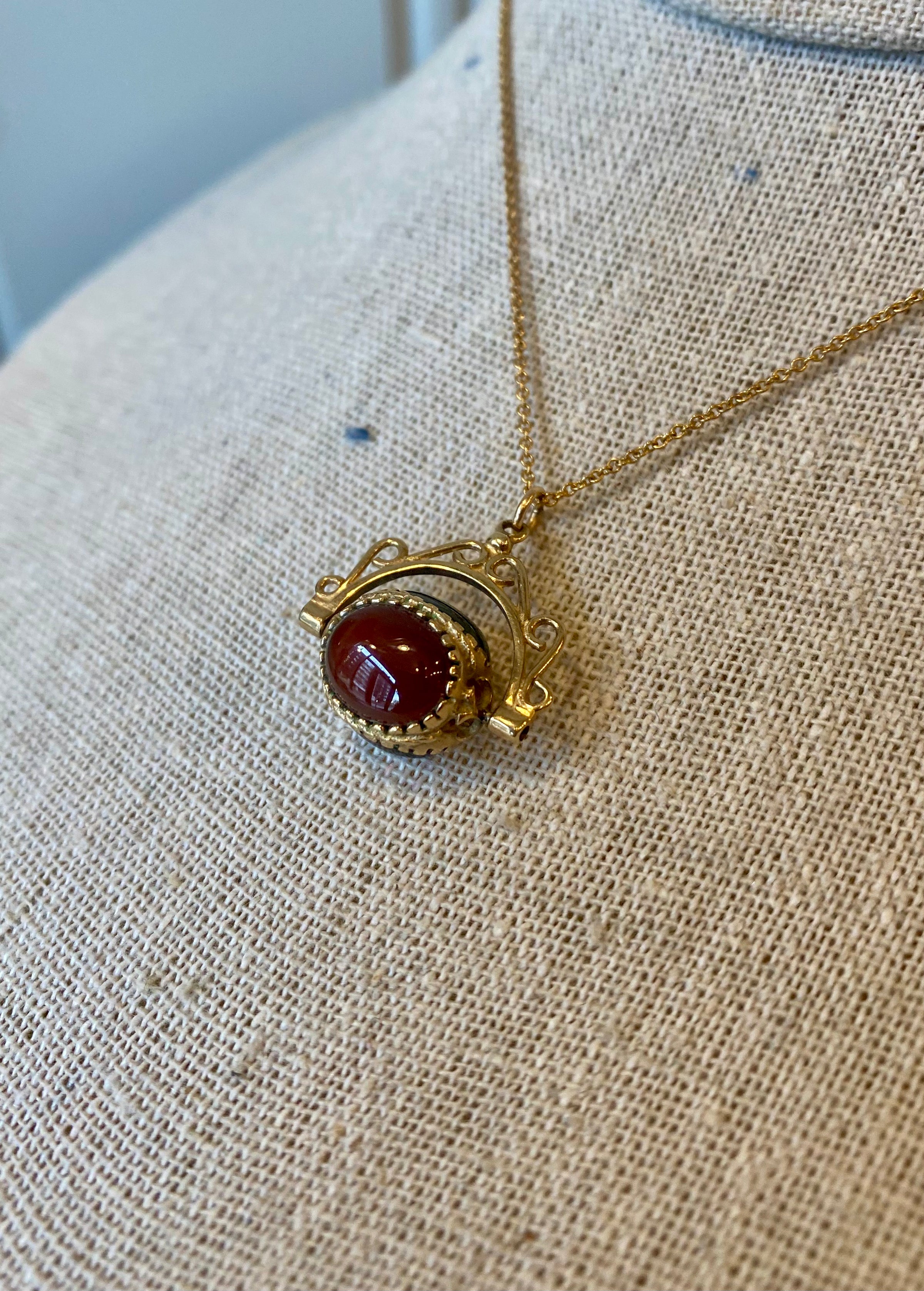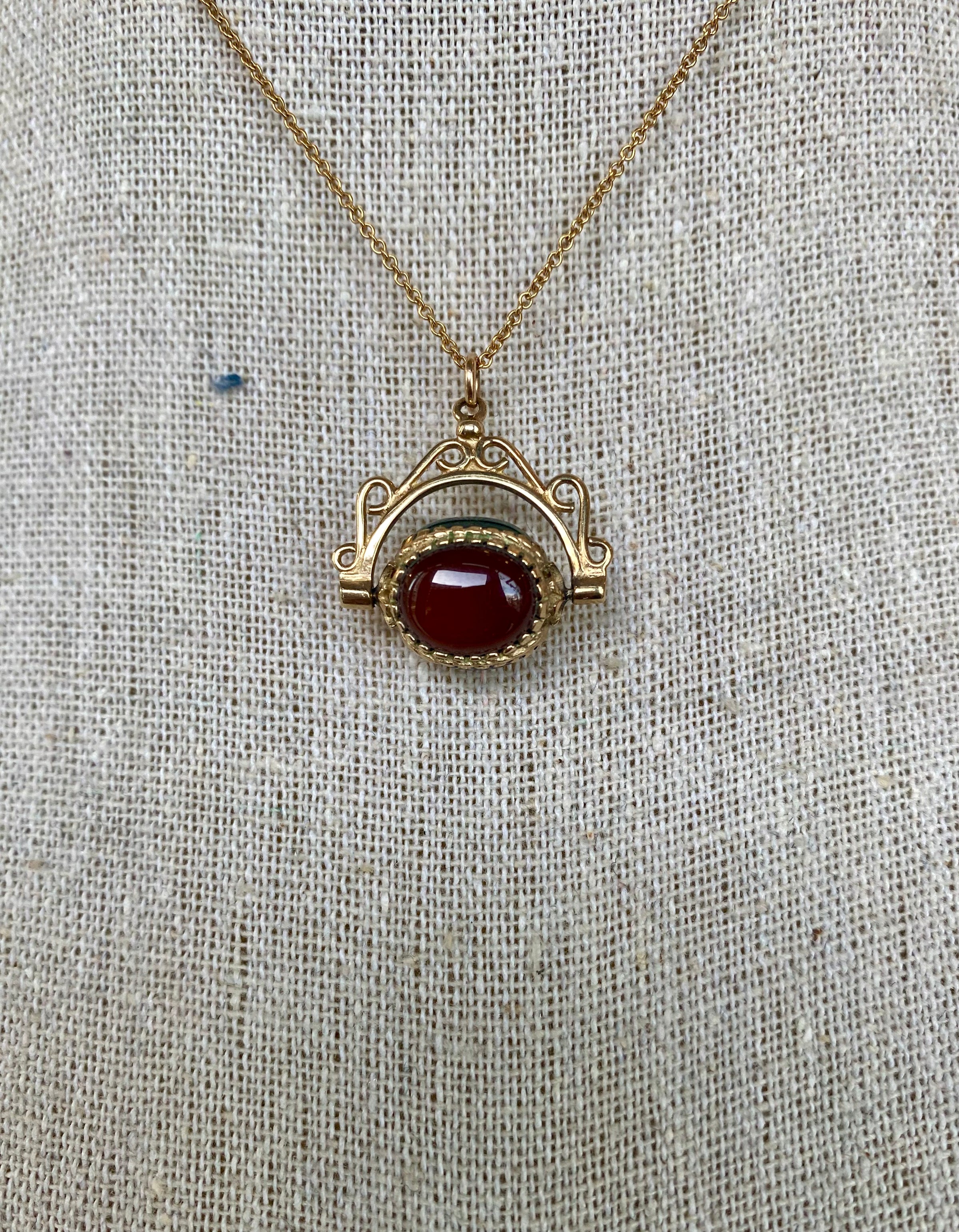 A wonderful and unique tri-lobed spinner. Featuring carnelian, bloodstone and onyx set in a delicate gold setting, this spinner makes a perfect addition to any style. Circa 1935-1950.