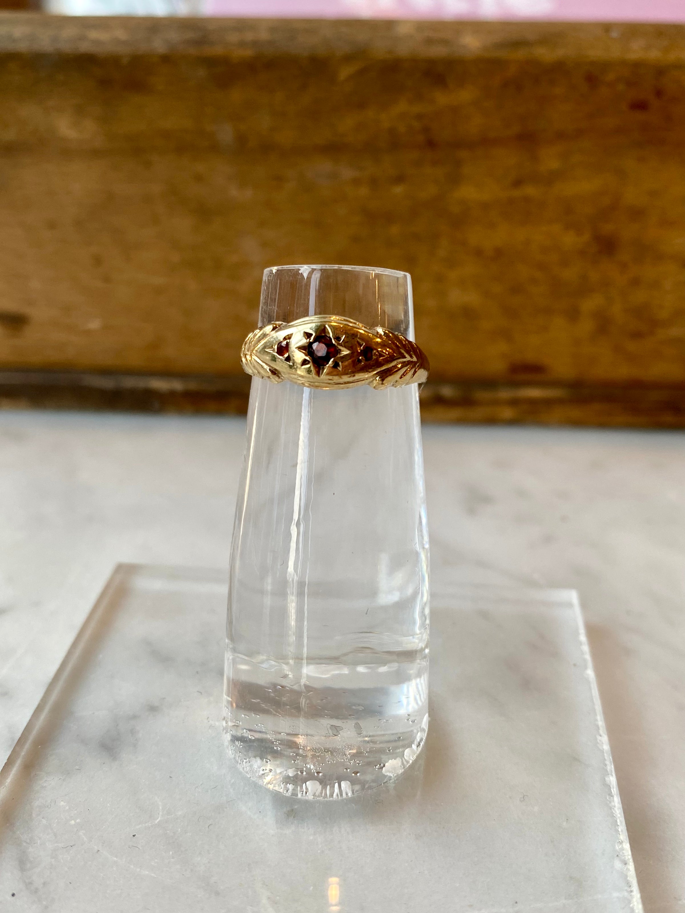 A heirloom ring set with three garnets surrounded by the engraving of a star, this little beauty would be a great addition to your style.